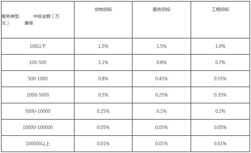 根據國家計委計價[2002]1980號文,工程招標代理服務收費以中標金額為基礎按差額定率分檔累進法計算,具體見下表:
