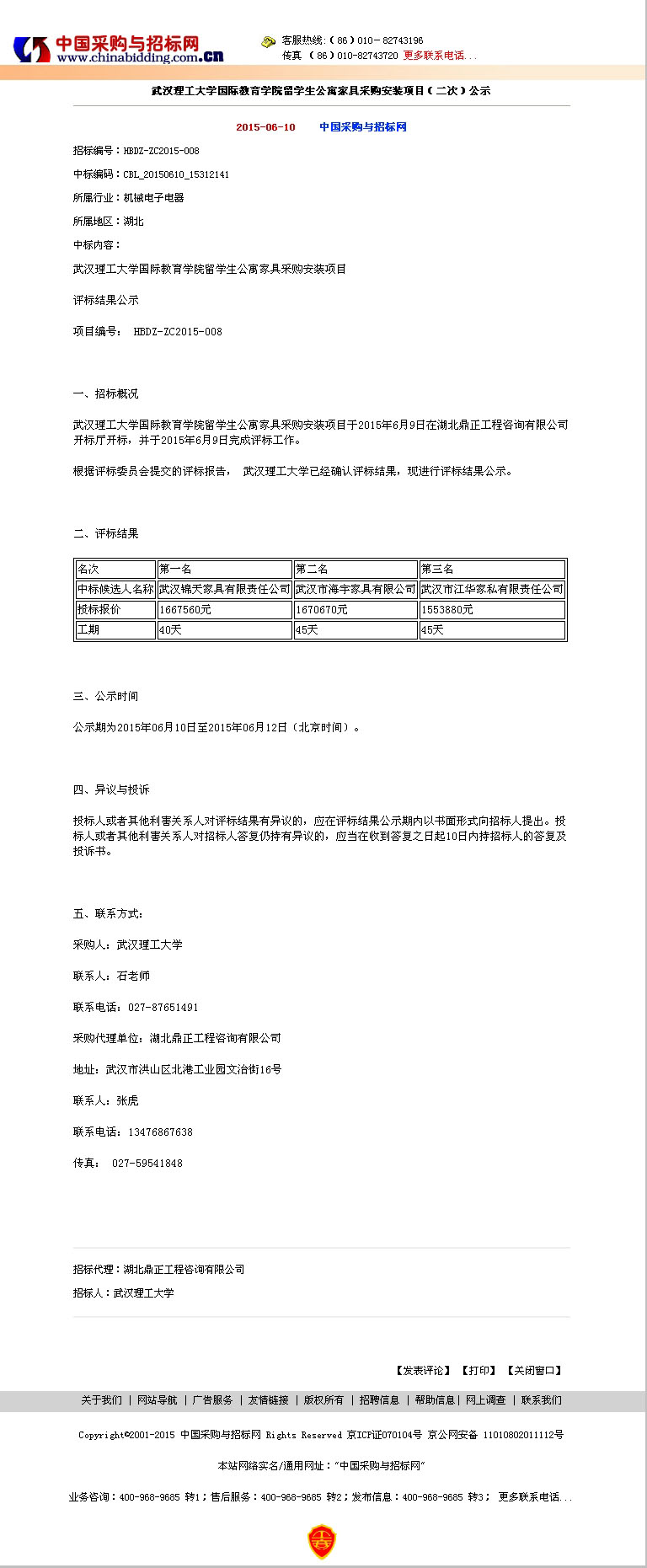 武漢理工大學國際教育學院留學生公寓家具采購安裝項目(二次)公示