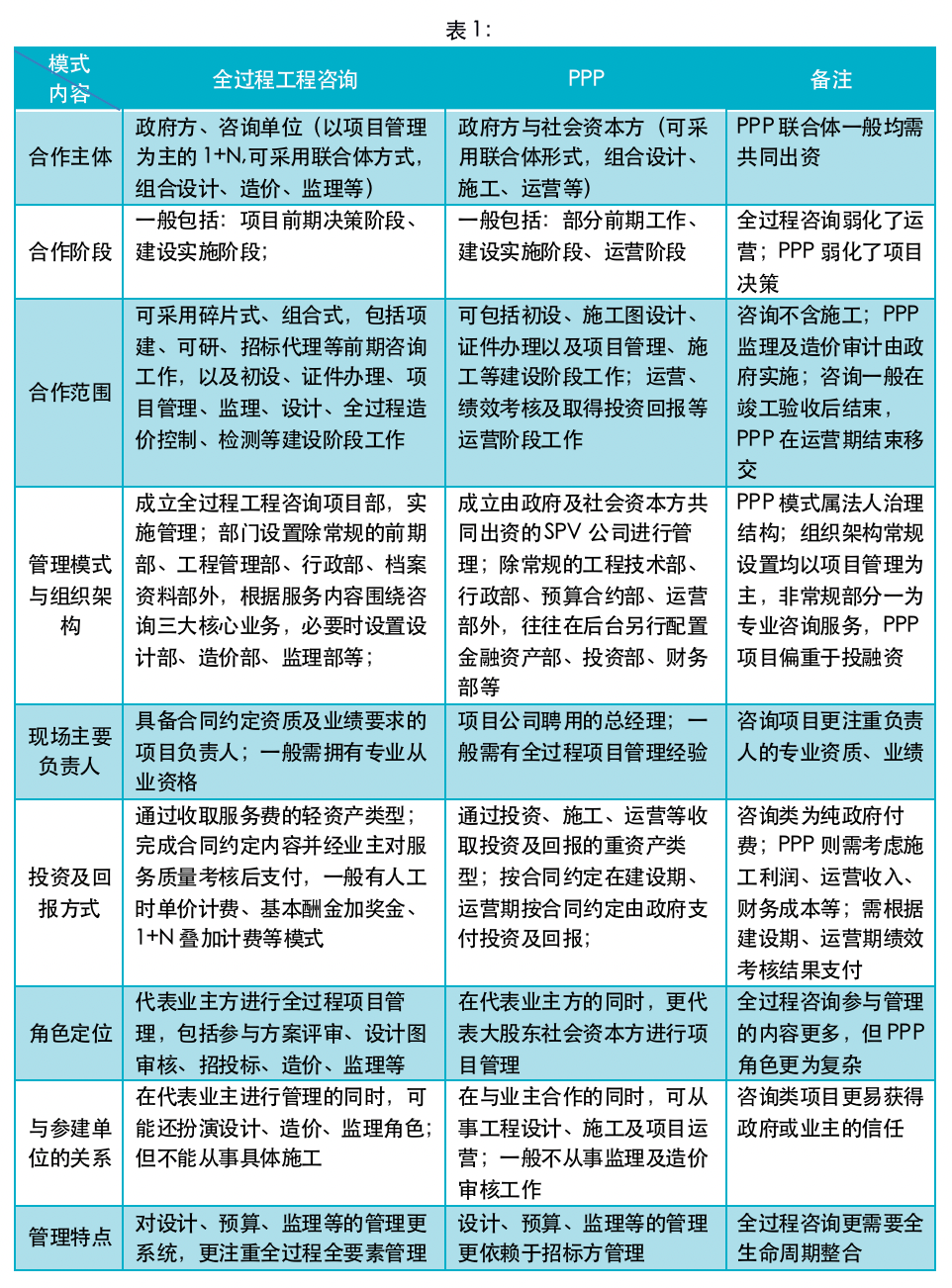 2、全過程咨詢與PPP項(xiàng)目管理要素的差異比較(見表1)