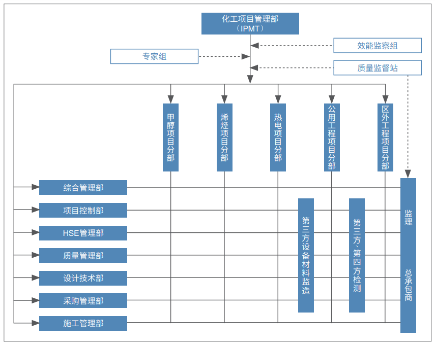 二是文件適用范圍。文件使用范圍包括PMC/IPMT團隊內(nèi)部管控;業(yè)主與項目管理公司接口協(xié)調(diào)與管控;管控EPC、監(jiān)理等各類參建單位;與政府主管部門協(xié)調(diào);覆蓋工程建設(shè)全過程(各階段、各專業(yè))5類。三是文件發(fā)布。項目管理體系文件由PMC編制,經(jīng)業(yè)主批準后發(fā)布;涉及管控EPC、監(jiān)理等參建單位的,應(yīng)列入招/議標文件發(fā)布。四是文件的價值。迅速整合業(yè)主項目管理團隊(PMC/IPMT)的工作,使其管理有序、科學(xué)合理、專業(yè)透明;符合法律、法規(guī)和政府監(jiān)管要求,奠定工程建設(shè)有序推進基礎(chǔ);業(yè)主管理文件(對項目執(zhí)行的具體要求)列入招/議標文件有利于承包商等投標人進行準確報價、作出承諾和響應(yīng),縮短中標后合同談判時間,業(yè)主管理文件成為合同附件(有法律約束力),將顯著減少合同糾紛。矩陣式管理結(jié)構(gòu),是常見的組織結(jié)構(gòu)形式之一。PMC/IPMT團隊即是業(yè)主方項目管理團隊,是工程建設(shè)的中樞指揮機構(gòu),其組織機構(gòu)的設(shè)計至關(guān)重要。項目的組織結(jié)構(gòu)形式一般有:職能型、項目型、矩陣型。通過大量工程建設(shè)實踐驗證,矩陣式管理結(jié)構(gòu)(矩陣型)是能夠迅速整合業(yè)主項目管理團隊(PMC/IPMT)的良好的項目組織結(jié)構(gòu)形式(圖3)。矩陣式管理結(jié)構(gòu)特征主要包括:一是項目部,主要解決“干什么”,負責(zé)執(zhí)行并完成項目工作;二是職能/專業(yè)部門,主要解決“怎么干”,為項目部提供技術(shù)支持。▲圖3 矩陣型組織結(jié)構(gòu)原理示意圖