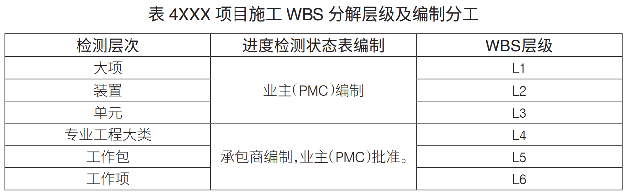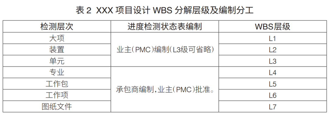 工程項目WBS分解層級:工程項目WBS分解主要是進行設(shè)計、采購、施工WBS分解。通常,設(shè)計WBS分解至七級、采購WBS分解至六級、施工WBS分解至六級,可滿足工程管理要求(表1)。