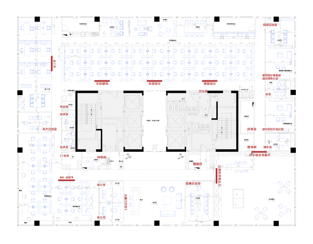 在空間規劃上,我們根據工作方式的特點,充分考慮功能與不同情境的活動需求,打造鼓勵與展示創意過程的空間氛圍。在這里,設計師們可以頭腦風暴、集思廣益、舌戰群儒;亦可以舉辦各種形式的研討與社交活動;還可作為規劃設計事業部對外展示與交流的窗口。