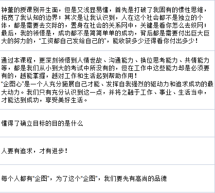 開堂的第一節(jié)課,他以《打開企圖心》為主題,以提問為主的方式,激發(fā)線上線下的學(xué)員深入思考:我們?yōu)楹味鴬^斗?我們因何而得到?既不是秀才(編者注:此語境下的含義為生活優(yōu)渥者)也不是落榜者(編者注:此語境下的含義為因失敗而發(fā)憤圖強者)的我們又當以什么作為自身前進的動力?……