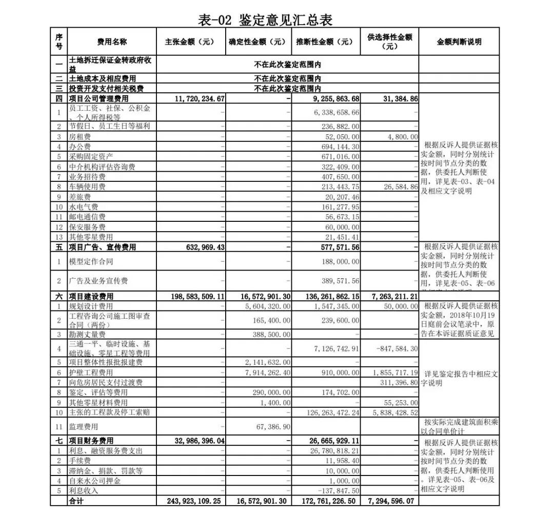由于本項目涉及費用項目、金額均較大,《鑒定意見書》中分別根據(jù)證據(jù)情況、國家文件規(guī)定、解除合同時間等分類方式,逐項對金額進(jìn)行了分類,并附加相關(guān)說明,為法庭判決提供了數(shù)據(jù)支撐。最終鑒定確定性金額16,572,901.30元,推斷性金額172,761,226.50 元,供選擇性金額7,294,596.07 元,具體詳表-02
