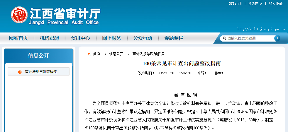 為進一步推動審計查出問題整改工作,加強對審計整改結果認定的指導,江西省審計廳印發了《100條常見審計查出問題整改指南》(以下簡稱《整改指南100條》)。《整改指南100條》按照常見的重大政策措施落實、預算管理、政府采購及招投標、基本建設、內控管理、企業管理、自然資源、社保資金及安居工程、金融管理、國外貸援款共10類審計內容進行問題分類,列舉了100個常見問題并給出相對應的整改方法說明,供審計機關和整改責任單位在審計整改工作中參照落實。整改特色亮點一是突出落實被審計單位整改主體責任;二是突出健全完善長效機制;三是突出問題分類整改。