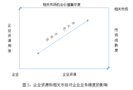 當前我國城建領域市場成熟度較低,市場價值集中度不高,比較適合進行多元化經(jīng)營。另外,企業(yè)的資源能力也決定了企業(yè)從事某項業(yè)務所可能實現(xiàn)的價值,企業(yè)在某項業(yè)務上的資源能力越強,說明企業(yè)在這項業(yè)務上的相對能力就較強。城投公司的多元化維度和規(guī)模主要由這兩種因素決定,如圖2所示: