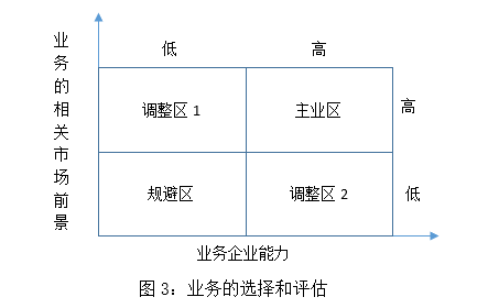 在調(diào)整區(qū)2中,城投公司在該業(yè)務上能力較強,但潛在的市場空間卻有限,公司也應當做出調(diào)整;如果集中資源能夠搶占競爭對手的市場,則應積極進入該業(yè)務領域,否則看這種能力是否能夠轉(zhuǎn)移,如果不能轉(zhuǎn)移,在盈利的情況下繼續(xù)經(jīng)營。