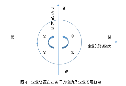 業(yè)務開始都是企業(yè)資源能力較弱,市場增長率很強,企業(yè)會注入資源;然后業(yè)務的企業(yè)能力變強,市場增長率會很高,企業(yè)繼續(xù)投入資源。但過了高增長期之后,該業(yè)務的增長率會降低,降低的原因是由于市場競爭者增多導致的。如果企業(yè)處于比較劣勢的地位,那么業(yè)務就會處于負增長,企業(yè)就應從中抽取資源投入有潛力或增長趨勢正強勁的業(yè)務。該業(yè)務的企業(yè)能力隨著資源的逐漸減少,業(yè)務能力弱化,企業(yè)進入第三象限,直至該業(yè)務消亡。
