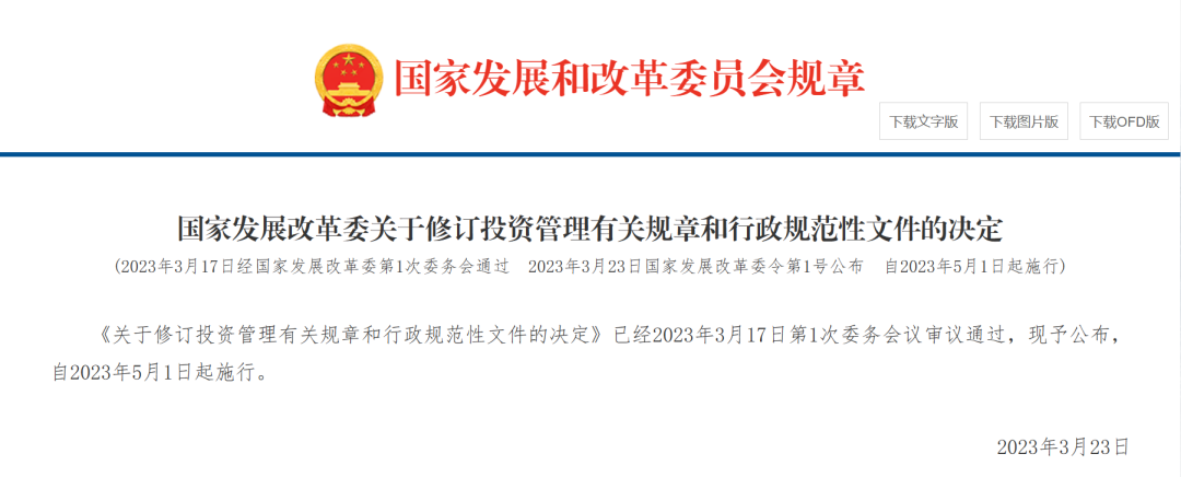 國(guó)家發(fā)改委《關(guān)于修訂投資管理有關(guān)規(guī)章和行政規(guī)范性文件的決定》自2023年5月1日施行!