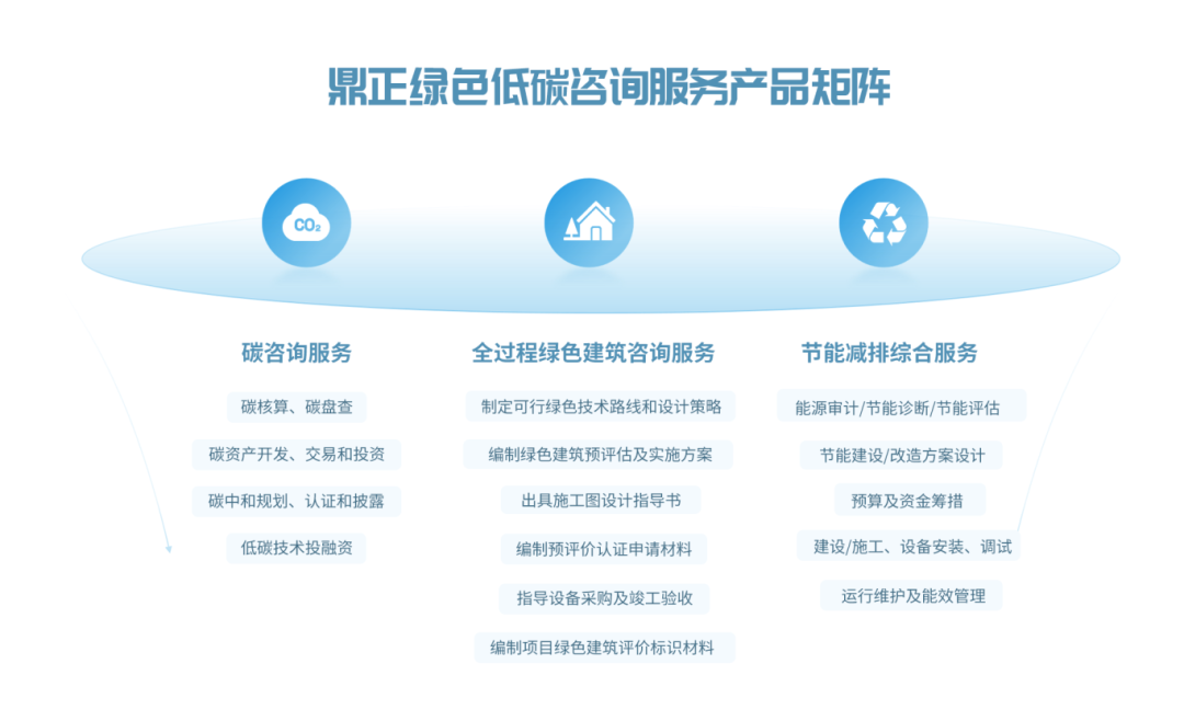 鼎正工程咨詢股份有限公司綠色低碳咨詢服務,圍繞城鄉建設發展綠色轉型進行服務,服務于工業、建筑、交通運輸、公共機構等重點領域,通過整合內外部資源,為政府、企業和相關機構提供全方位的綠色低碳項目投融資策劃咨詢,用能及碳排放狀況診斷、節能降碳方案、設計、改造(施工、設備安裝、調試)、運行管理、碳資產評估等服務。