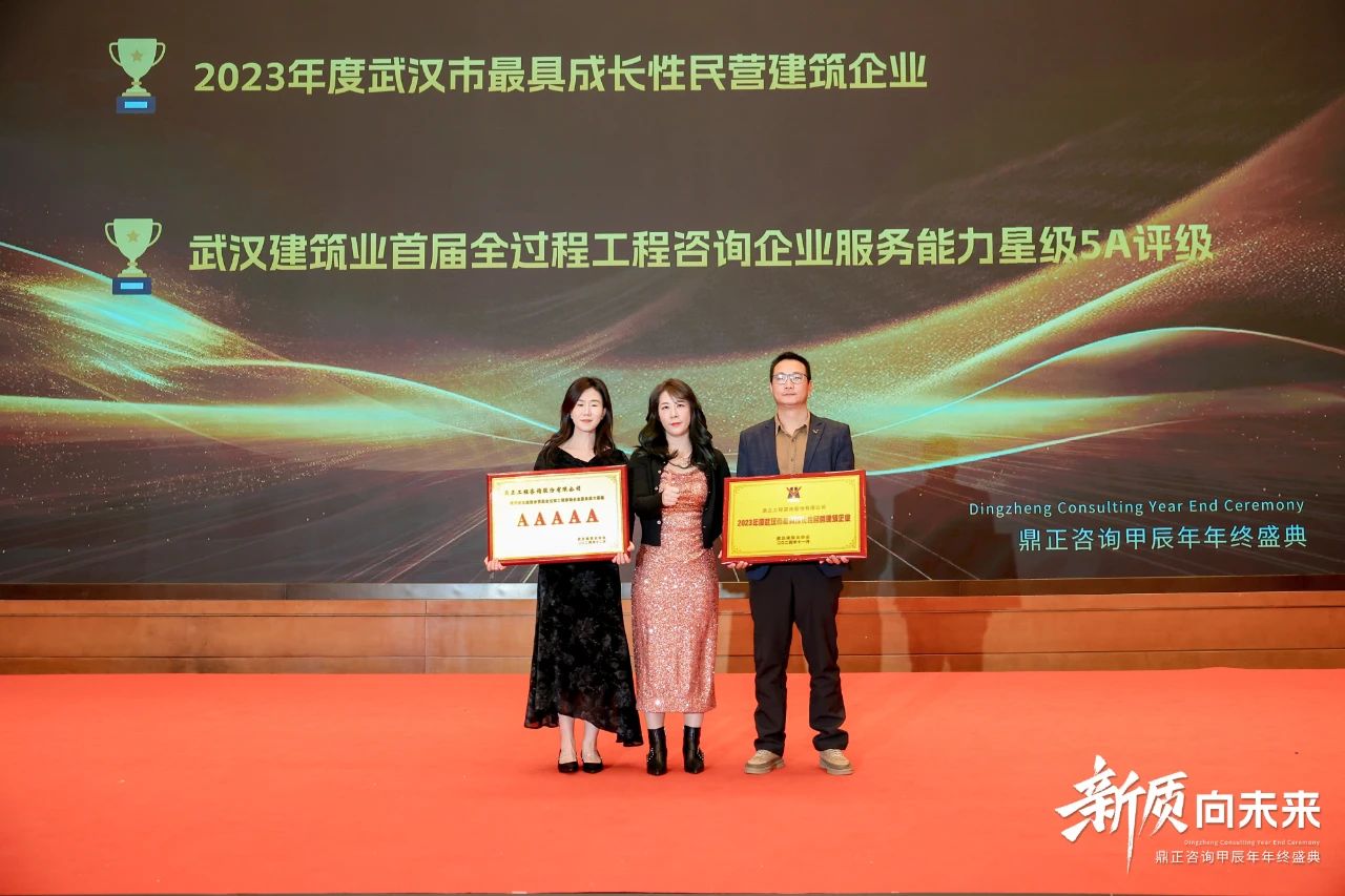 在過去的一年里,鼎正在專家輔助人、專項(xiàng)債、超長期特別國債、中央預(yù)算內(nèi)資金、全過程工程咨詢等業(yè)務(wù)板塊中,展現(xiàn)出強(qiáng)勁的創(chuàng)新力,并獲得行業(yè)廣泛的認(rèn)可。當(dāng)晚,武漢建筑業(yè)協(xié)會領(lǐng)導(dǎo)代表、全咨分會秘書長陳金琳女士,為我們頒發(fā)了2023年度武漢市最具成長性民營建筑企業(yè)、武漢建筑業(yè)首屆全過程工程咨詢企業(yè)服務(wù)能力星級5A評級兩項(xiàng)榮譽(yù)。