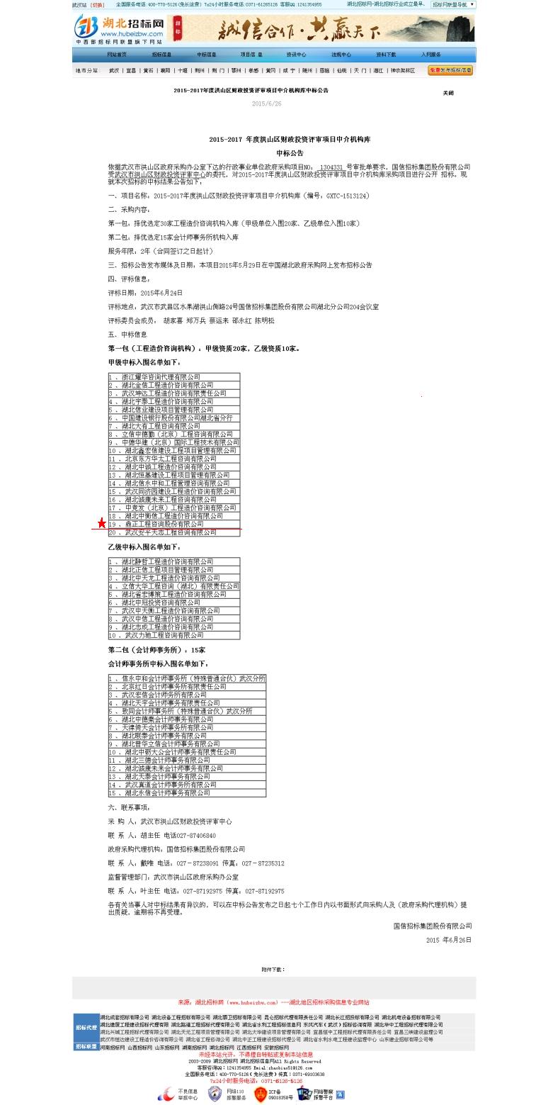 【經(jīng)營成果】我司入圍2015-2017 年度洪山區(qū)財(cái)政投資評審項(xiàng)目中介機(jī)構(gòu)庫