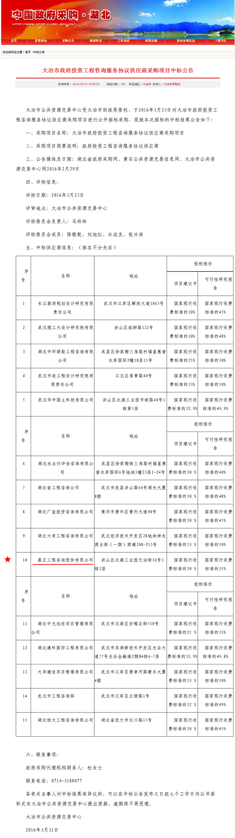 【經營成果】我司中標大冶市政府投資工程咨詢服務協議供應商采購項目