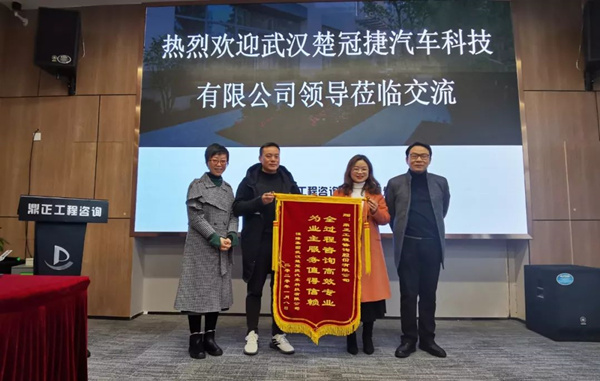 2020年1月14日,武漢楚冠捷汽車科技有限公司龔經(jīng)理、朱主任蒞臨鼎正咨詢公司,特向?yàn)槠涠趶S房建設(shè)項(xiàng)目提供全過程工程咨詢服務(wù)的鼎正咨詢團(tuán)隊(duì)及項(xiàng)目負(fù)責(zé)人程正一贈(zèng)送錦旗并表達(dá)感謝
