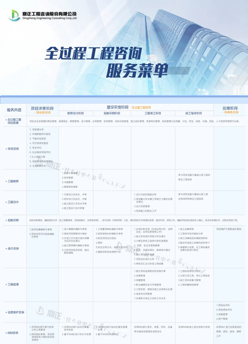 鼎正咨詢(xún)資質(zhì)資信及業(yè)務(wù)能力已覆蓋工程咨詢(xún)?nèi)a(chǎn)業(yè)鏈,可提供全過(guò)程工程咨詢(xún)、PPP全生命周期咨詢(xún)、項(xiàng)目策劃、工程投資咨詢(xún) 、土地利用規(guī)劃、城鄉(xiāng)規(guī)劃、工程設(shè)計(jì)、工程監(jiān)理、招標(biāo)代理、政府采購(gòu)、工程造價(jià)咨詢(xún)、BIM咨詢(xún)等服務(wù)。