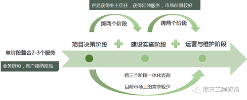 跨階段全過(guò)程程咨詢(xún)指提供跨兩個(gè)階段的服務(wù),能實(shí)現(xiàn)項(xiàng)目管理+2項(xiàng)以上專(zhuān)業(yè)咨詢(xún)服務(wù),容易獲得業(yè)主信任,獲得延伸服務(wù),市場(chǎng)前景較好